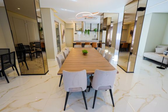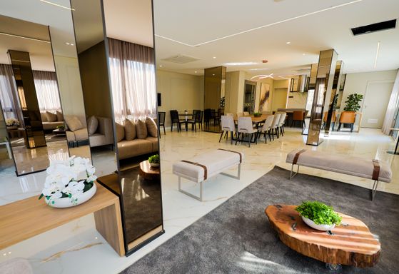 Plantas de 125 m² dispõe de até 4 dormitórios, sendo duas suítes, varanda gourmet, lavabo e duas vagas de garagem; há opção de planta com três suítes e living ampliado.
